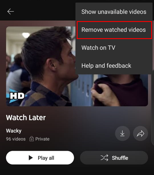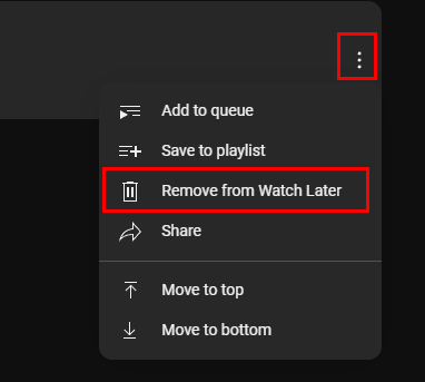 - In the Watch Later menu, tap the three vertical dots located at the top right of the screen and choose Remove from Watch Later.