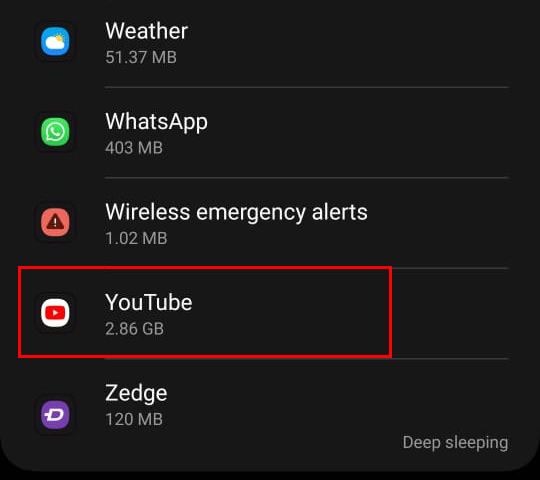 - Scroll through the app list until you find YouTube. Tap on it.