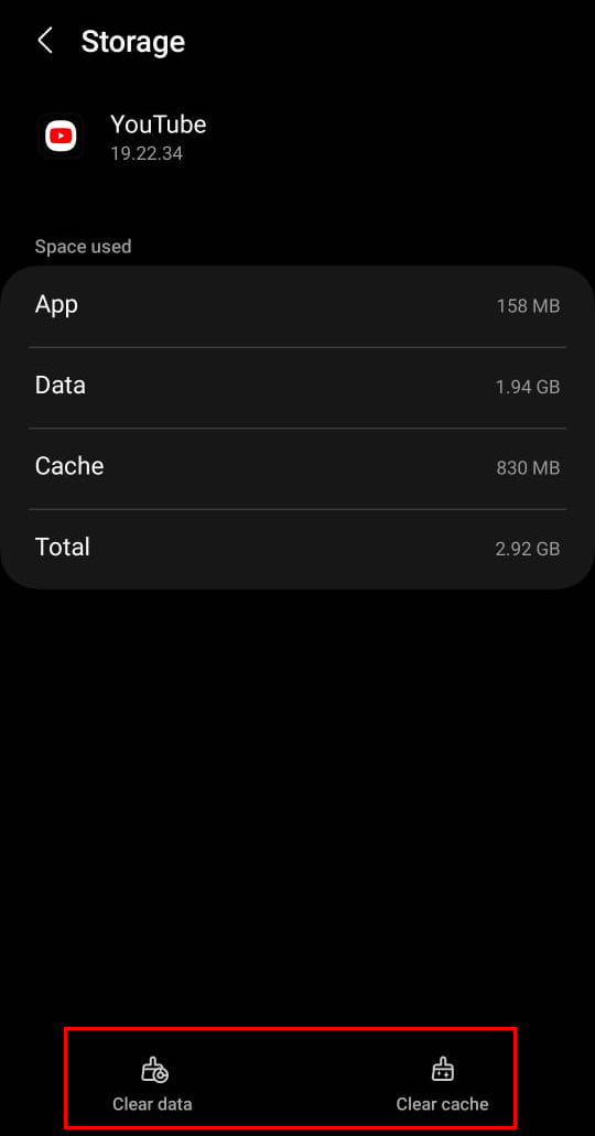 - In the Youtube App Info, tap on Storage. Inside this menu, select Clear data and confirm the action.