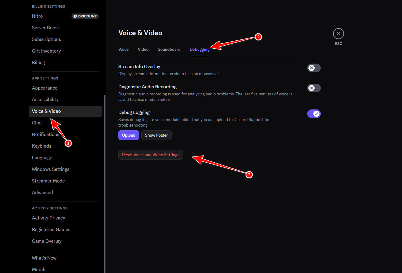 Wrong or damaged voice settings can stop Discord from forming a valid route. Resetting restores the default audio system and removes misconfigurations that interrupt communication.