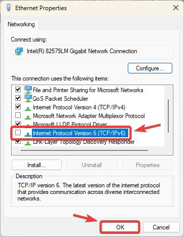 - Uncheck Internet Protocol Version 6 (TCP IPv6).