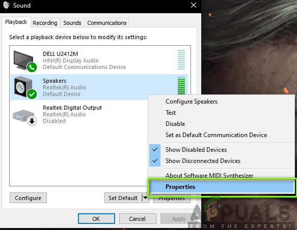 Sound – Control Panel - Once in sound settings, click on Playback tab and select your output device. Right-click on it and select Properties.