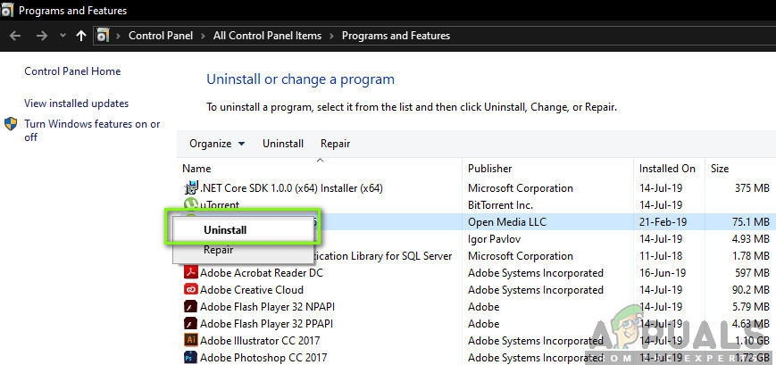 - Once in the application manager, search for the program which is causing the issues. Right-click on it and select Uninstall.