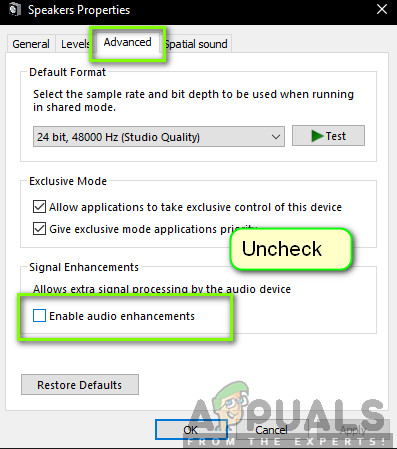 Note: If your sound enhancements are already turned off, we recommend turning them on and then try playing Forza. If this doesn’t help, turn the settings back off and then try again. Even though these actions sound bizarre, we came across numerous instances where this trick helped a lot of users solve their problem.