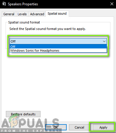 Disabling Audio Enhancements - Now, click on Spatial sound tab and turn off the sound. Press Apply to save changes and exit.