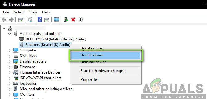 - Once in the device manager, expand the category of Audio inputs and outputs, right-click on your sound device and select Disable Device.