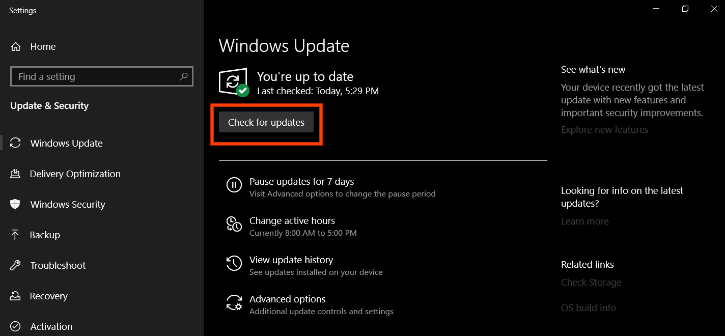 Clicking on the “Update and Security” option - Click on the “Check for Updates” option and let the operating system check for any missing updates on your computer.