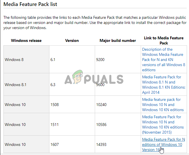 - Open a browser and visit this Microsoft Support link for the Media Feature Pack. Scroll to the Media Feature Pack list and find your Windows version.