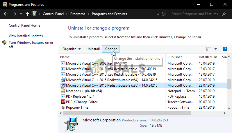 - Find the Microsoft Visual C++ Redistributable entry. For multiple entries, repeat the process for all, skipping older versions (2008 or older). Left-click its entry and select Change from the bar at the top.