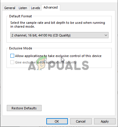 - After that, head over to the Advanced tab and check the Exclusive mode Uncheck the box next to the Allow applications to take exclusive control of this device option.