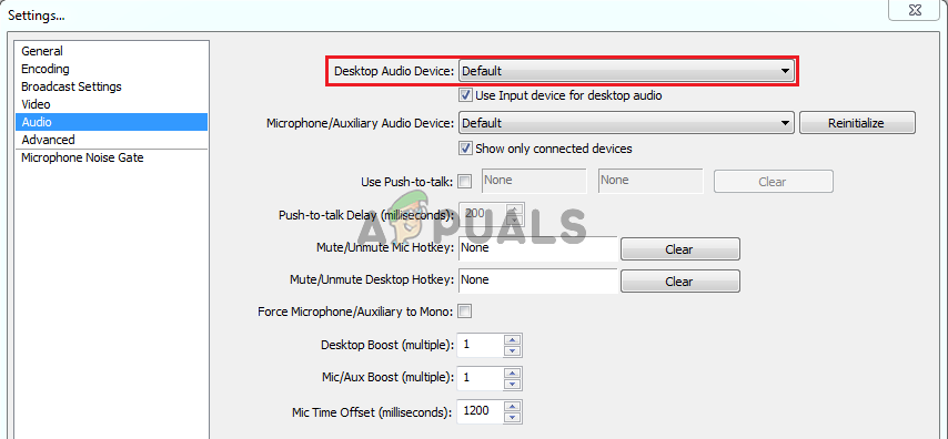 - Click the dropdown menu at the Desktop Audio Device entry and set it to Default. If it’s already set to default, make sure you set it to the other device which will appear on the menu. Apply the changes and check to see if the game audio capturing problem is resolved in OBS!