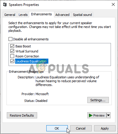 - Once inside Speakers Properties, navigate to the Enhancements In the list of available enhancements, make sure you check the boxes next to Bass Boost, Virtual Surround, and Loudness Equalization.