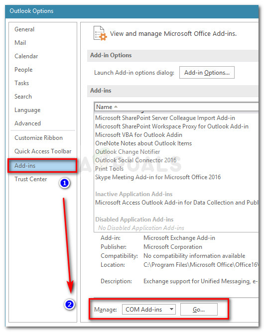 - In the Outlook Options menu, click on Add-ins from the right pane. Then, go to the bottom of the screen, use the drop-down menu to select COM Add-ins and click the Go button.