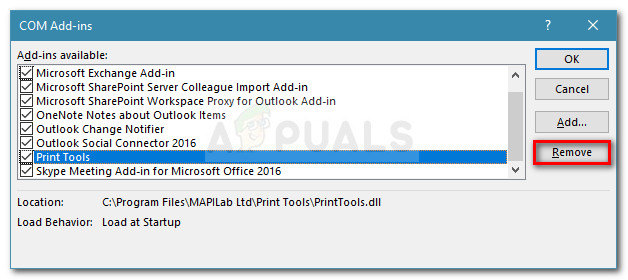 - Once you manage to identify your culprit, select it from the COM Add-ins window and click the Remove button.