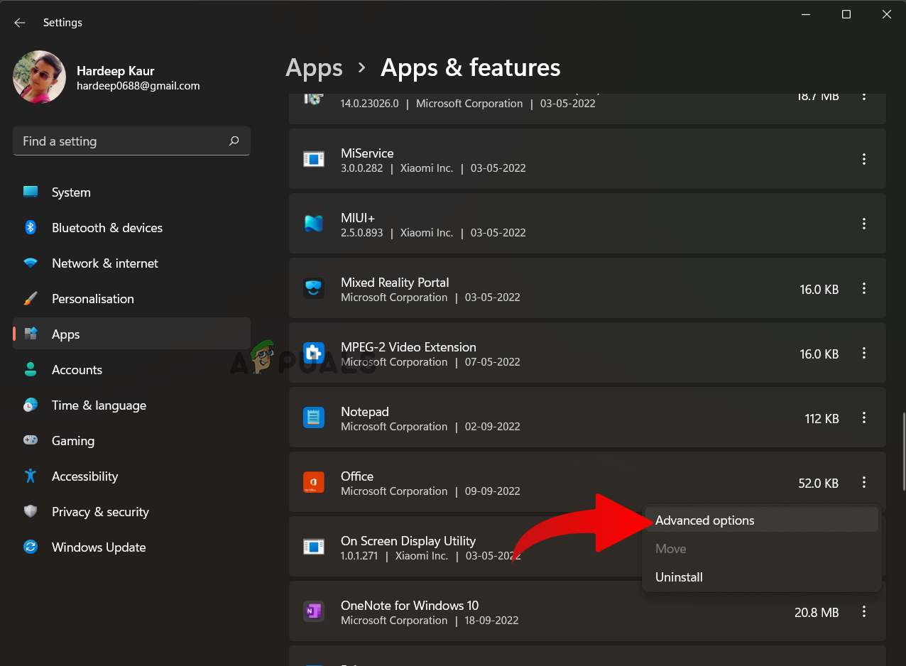 Click on Apps & Features - Click on the three dots next to Office and choose the Advanced options.