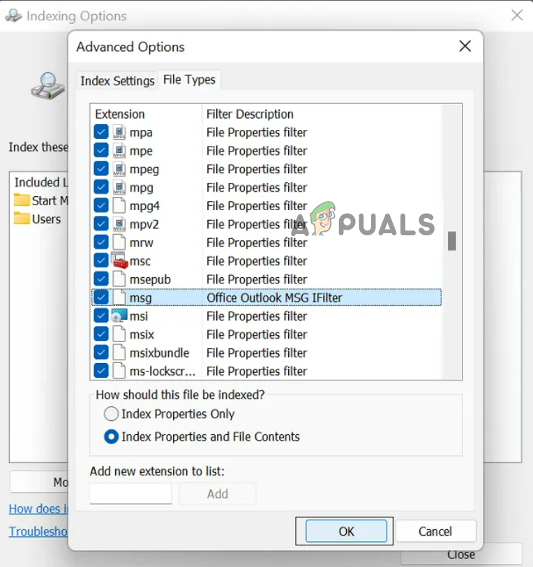- Scroll down, select msg extension, and mark the option Index Properties and File Contents.