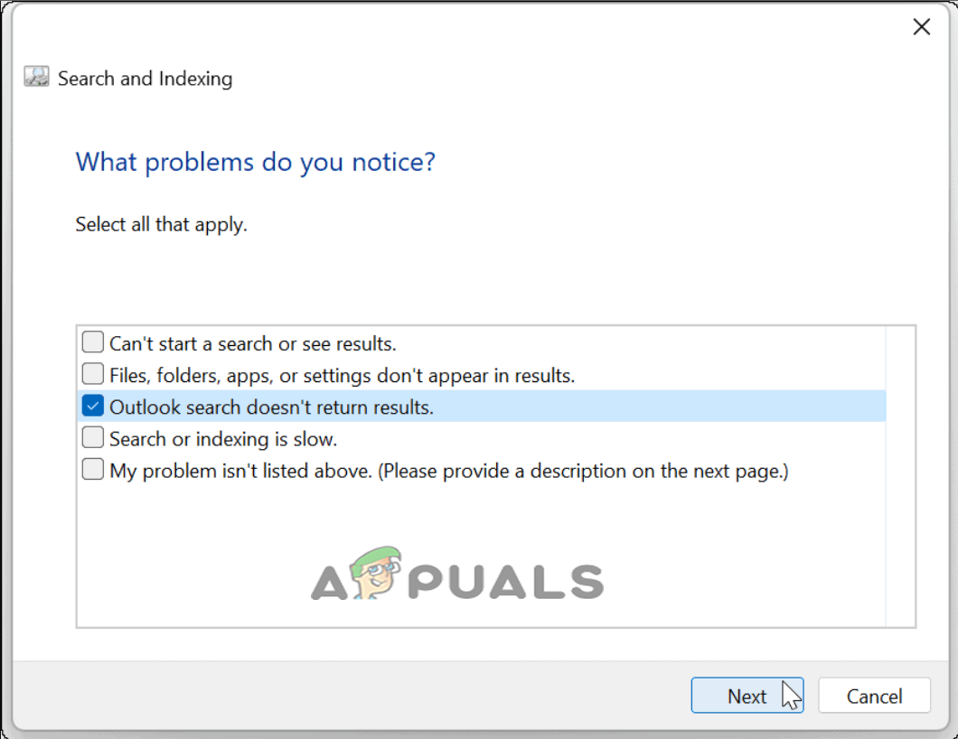 Choose Outlook search doesn’t return results option. - When you run the troubleshooter, it will recognize and fix the problems automatically.