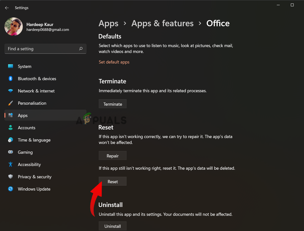 Outlook’s internal issues can be the primary reason for such occurrence. Here, it is suggested to reset the office app on Windows 11 to resolve the issue in the first instance. You can do so by following the below steps: