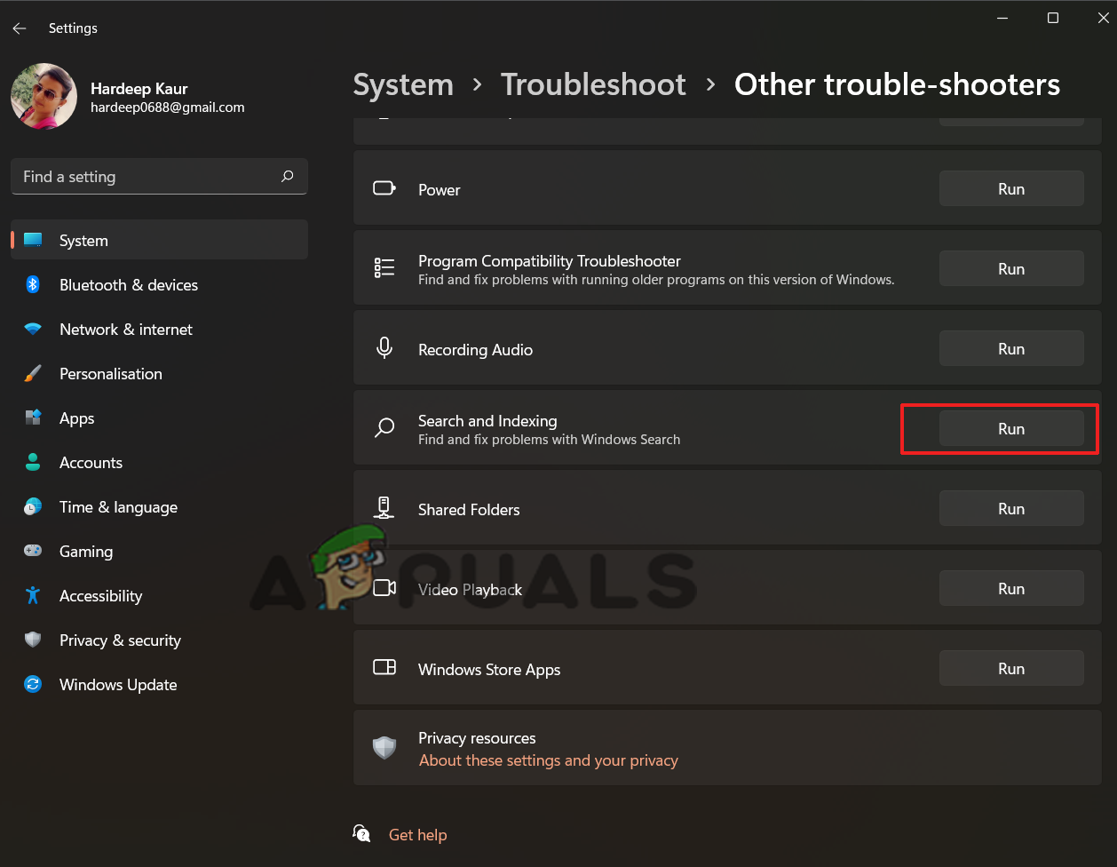 Click on Other troubleshooters - Scroll down and navigate to the Search and Indexing option.