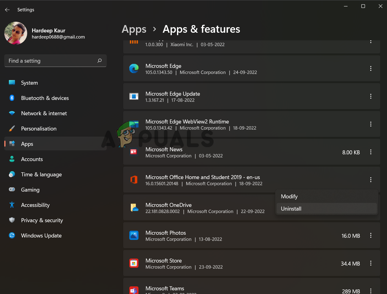 - Tap the three dots on the Microsoft Office program section and choose Modify option.