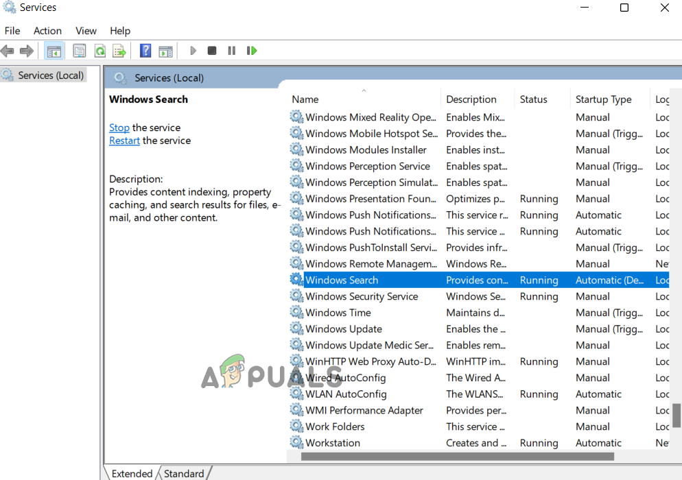 Type services.msc and click Ok. - On the Services window, navigate to the option Windows Search under the name section and select it.