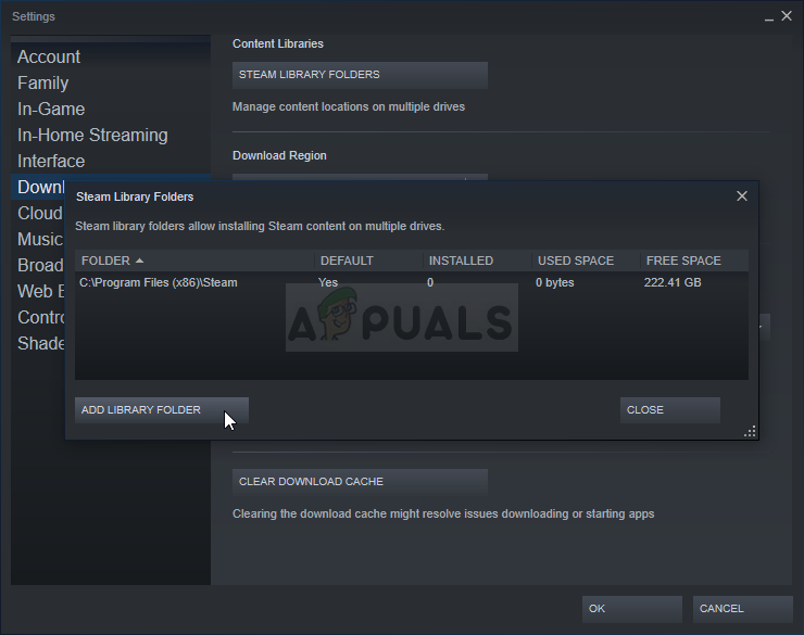 - After the Steam client opens, click the Steam button at the top right part of the window and choose Settings. Navigate to the Downloads tab in the Settings window and click on Steam Library Folders. Click the Add Library Folder