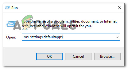 - Press Windows key + R to open up a Run dialog box. next, type ‘ms-settings:defaultapps‘ and press Enter to open up the Default Apps menu of the Settings app.