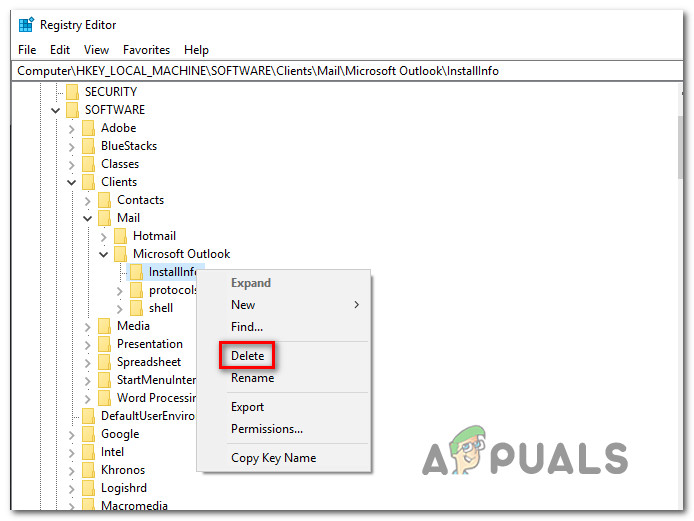 - When you get to the correct location, right-click on each sub-key of Microsoft Outlook and choose Delete to get rid of them. Do this consistently until you manage to remove every sub-key belonging to Microsoft Outlook.
