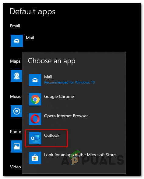 - The email client is not set as the default – If you have an additional email client but you’re still encountering this issue, it’s probably because the email client is not configured to be the default client. In this case, you will be able to fix the issue entirely simply by using the Default Apps menu to change the default app for email.