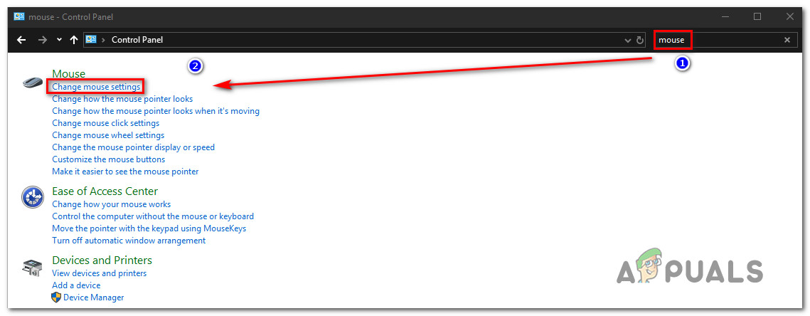 Running Control Panel - Once you’re inside the classic Control Panel interface, use the search function in the top-right corner to search for ‘mouse’. Next, from the list of results click on Change mouse settings.