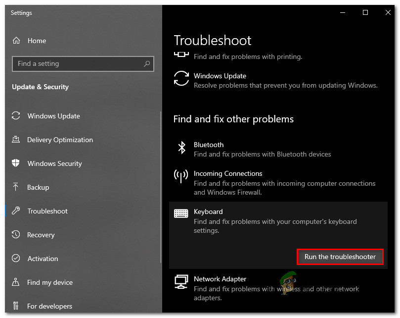 - Corrupted / Incomplete driver – As it turns out, this particular issue can occur because the keyboard/mouse driver that is being used is not complete or is corrupted to the point where it ends up triggering some keys even if the user didn’t press that key physically. In situations like this one, the best course of action would be to run the built-in keyboard troubleshooter and fix the driver inconsistency automatically.