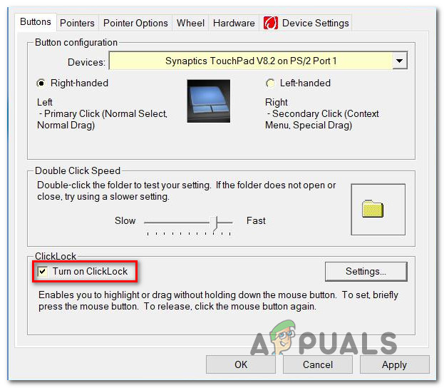 Several Windows users that were also struggling to resolve this issue have reported that they managed to resolve the issue by accessing the Mouse Properties screen and disabling ClickLock.