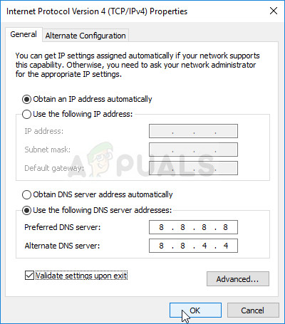 - Stay in the General tab and switch the radio button in the Properties window to “Use the following DNS server addresses” and use 8.8.8 and 8.8.4.4 respectively. Switch to “Use the following IP address” and use the same number as the Default Gateway you took note of but change the last digit after the last dot so something else. Fill out other information the same as you took note.