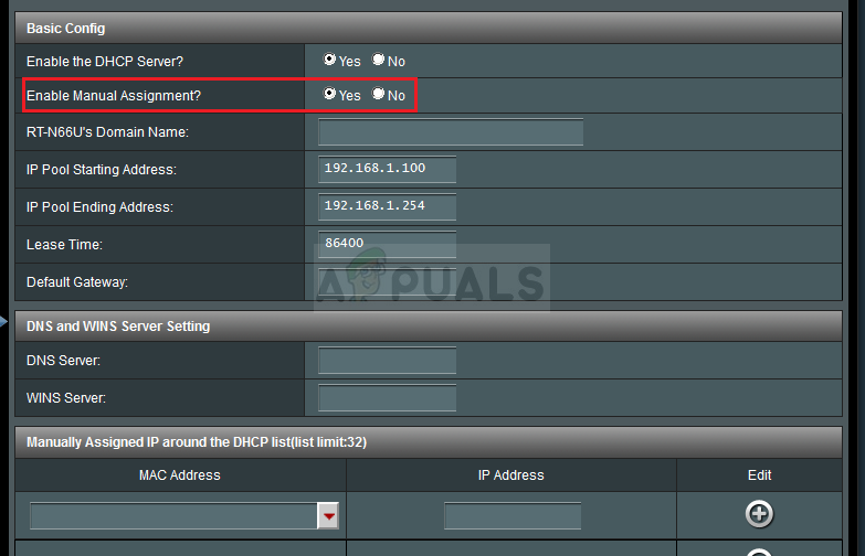 - First of all, find the Enable Manual Assignment setting and click the radio button next to Yes. Locate the window which allows you to type in the MAC address and the IP address of your choice so type in everything you have gathered in the previous steps for your respective computer.
