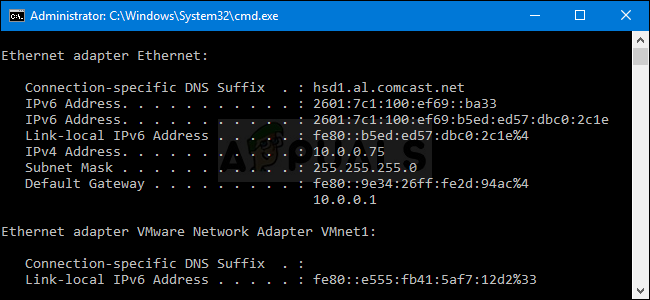 - Type in the command which will be displayed below and scroll down towards the network adapter which corresponds with the connection you are using. Take note of Default Gateway, Subnet Mask, MAC and DNS