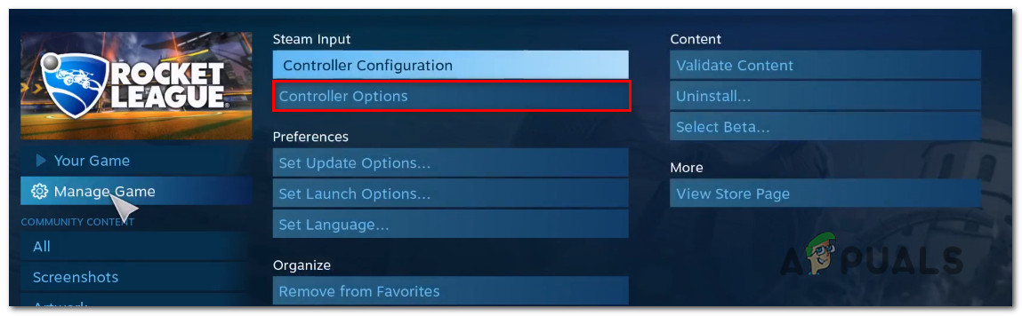- In Big Picture mode, click on Library and select Rocket League, then choose Manage Game.