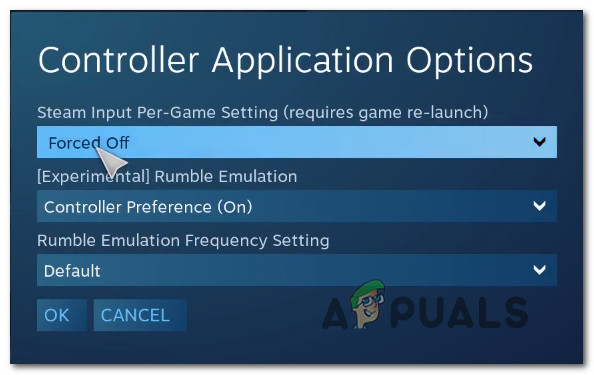 Accessing the Controller Options in Steam - Set Steam Input Per-Game Setting to Forced Off and click Ok.