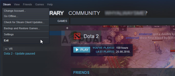 - Make sure you exit the Steam client on your computer completely by clicking Steam >> Exit from the top-side menu or right-click the Steam icon at the lower right part of the screen (system tray) and choose Exit.