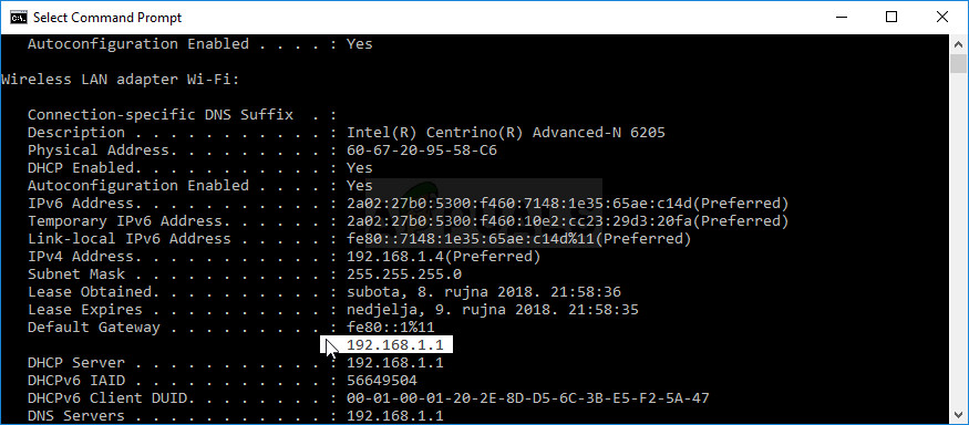 - Type in the command which will be displayed below and make sure you scroll down towards the network adapter which corresponds with the type of connection you are currently using to connect to the Internet and take note of Default Gateway entry, especially the entry looking like xxx.xxx.x.x where ‘x’ letters correspond to numbers.