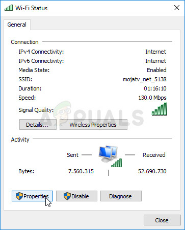 - Now that the Internet Connection window is open using any method above, double-click on your active Network Adapter and click on the Properties button below if you have admin permissions.