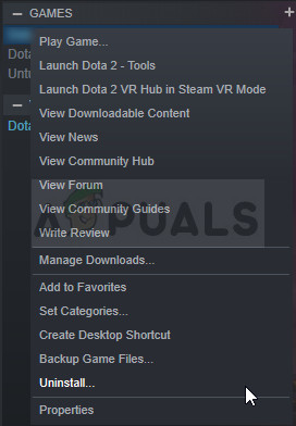 - Right-click the game’s icon in the library and choose the Uninstall option from the context menu which will open.