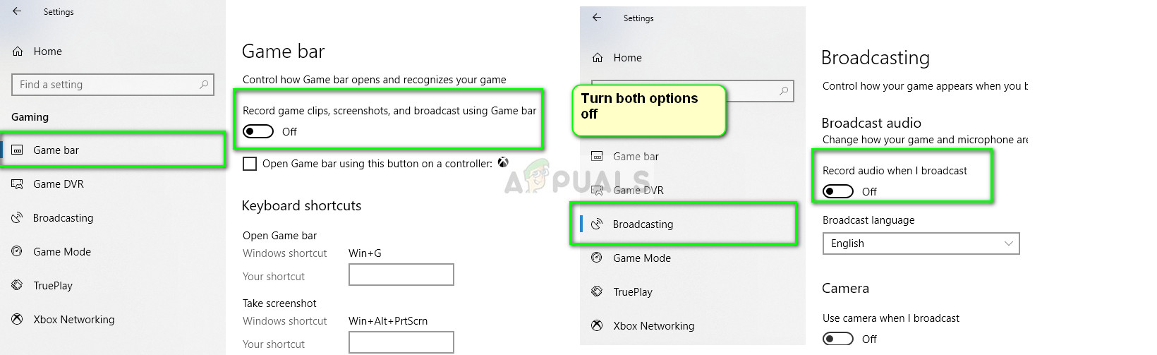 - Turn off the option ‘Record game clips, screenshots, and broadcast using Game bar’ found under Game bar. Next, under Broadcasting, turn off ‘Record audio when I broadcast‘.