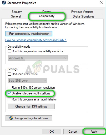- Under the Compatibility tab, tick the Disable fullscreen optimizations option.