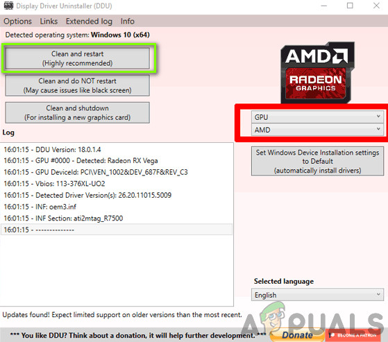 - Once in the application, click on Clean and Restart. DDU will now remove all the existing driver files and restart your computer after the action is done.