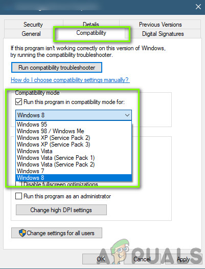 - Once in properties, select the Compatibility Check the option Run this program in compatibility mode for and select another operating system. Preferably go with Windows 8 or 7.