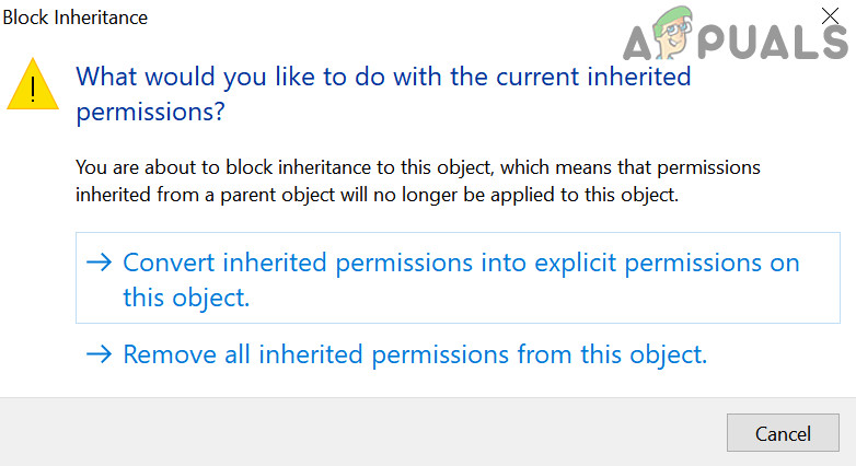 - Now click on the Disable Inheritance button (near the bottom left of the window) and select “Remove All Inherited Permissions from This Object”.