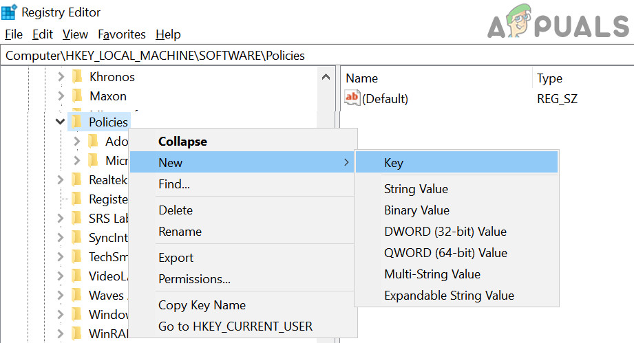 - If not, then in the left pane, right-click on Policies and choose New > Key.