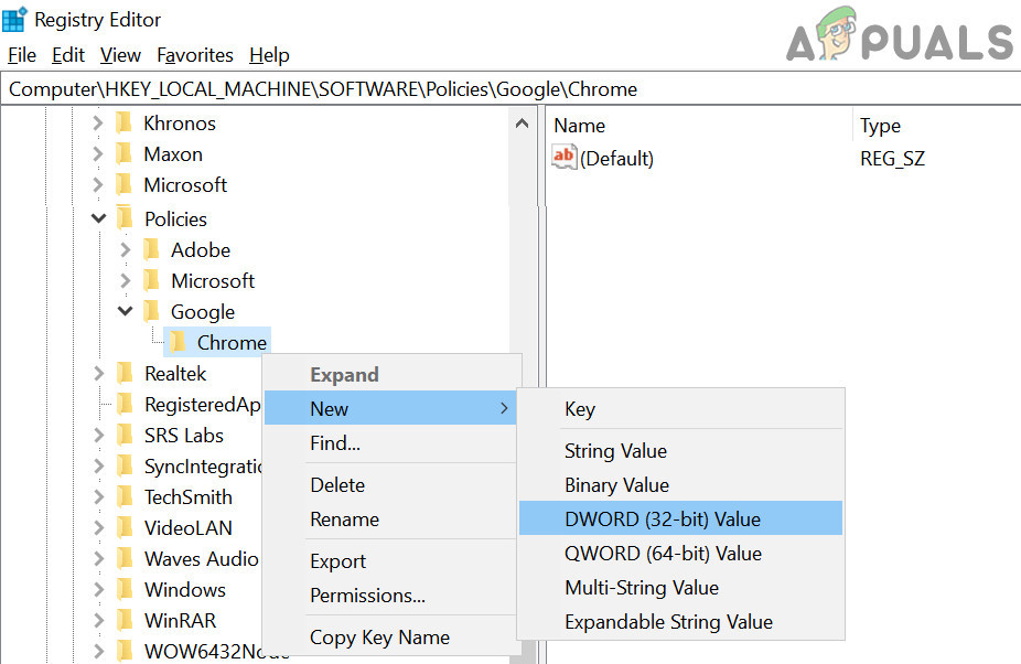 - Again, in the left pane, right-click on the Chrome key and select New > Dword (32-bit) Value.