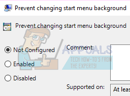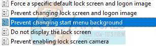- Now, look for an entry present on the right side of the screen named “Prevent changing start menu background”. Double click it to change its settings. You can also perform the same steps for the entry of “Prevent changing lock screen and logon image”.