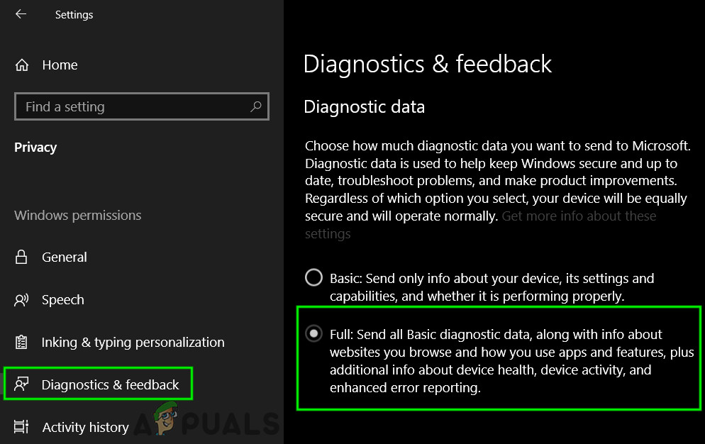 This error also seems to go away when we change the feedback and diagnostics settings. By default, the diagnostics are set as basic so Windows is updated and secure. We can try changing the level higher to ensure that our problem goes away.
